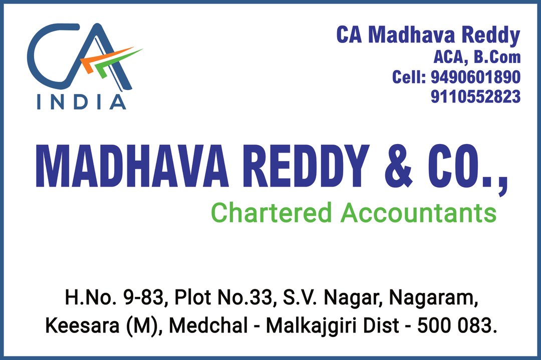 Madhava Reddy & Co is a premier Chartered Accountants firm located in Nagaram, Hyderabad, specializing in a comprehensive range of tax and accounting services. Our expert team excels in income tax filing, GST return filing, and all-encompassing tax services. We offer meticulous accounting and bookkeeping solutions tailored to meet your specific business needs. Additionally, Madhava Reddy & Co provides reliable VISA certification and PF ESI registrations along with monthly filings. We also handle company and partnership registrations, ensuring compliance and smooth business operations. Trust Madhava Reddy & Co for all your financial service requirements in Hyderabad.